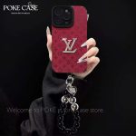 Premium red monogram textured phone case featuring a bold metallic logo and elegant detachable beaded wrist strap. Luxury look with strong protection.